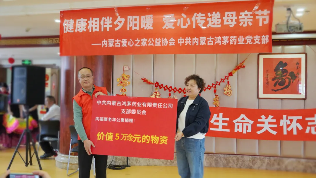 5月9日母亲节前夕,中共内蒙古hjc888黄金城药业有限责任公司党支部委员会联合内蒙古爱心之家公益协会,走进内蒙古福康老年公寓,以“健康相伴夕阳暖 爱心传递母亲节”为主题,为百余位高龄老人送上价值5万余元的健康物资以及鲜花、定制蛋糕。